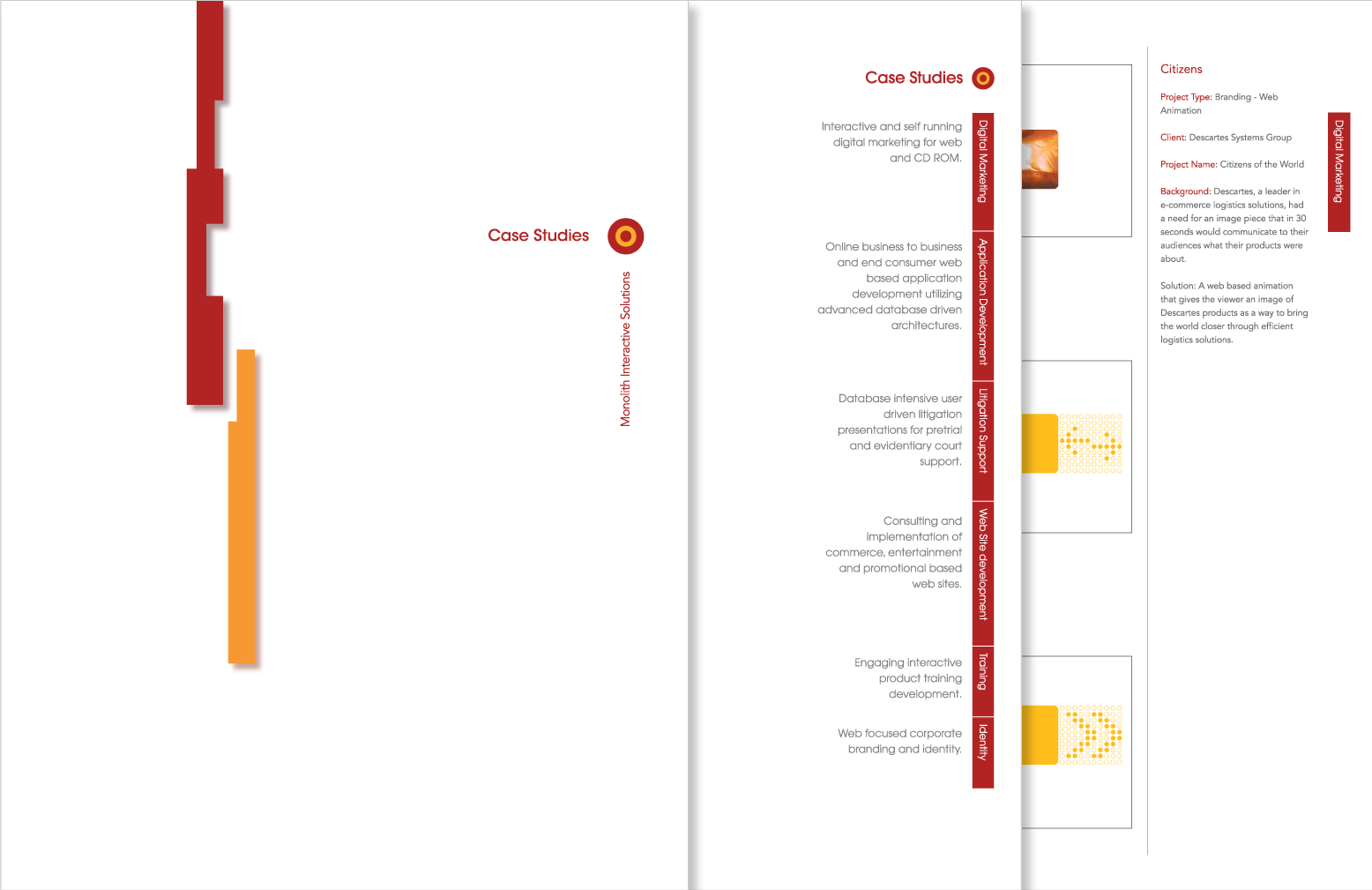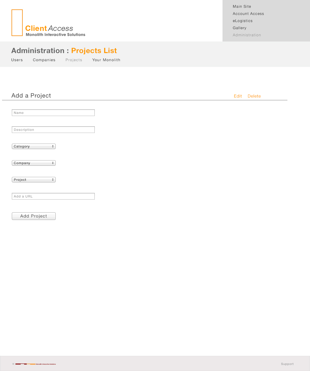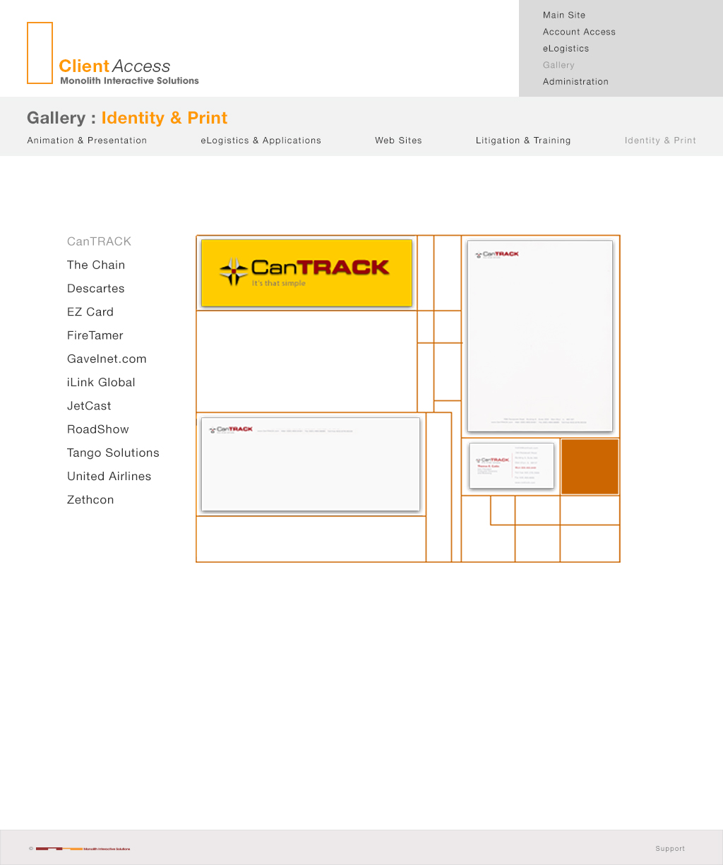 In addition to the companies identity package, I developed a password-secured website to allow clients of Monolith to view the status of their projects. The client could review prototypes, flowcharts, contracts, and deliverable dates, and could upload content and access the project before being finalized or going live. The site was also used to prepare individualized presentations for prospective clients.