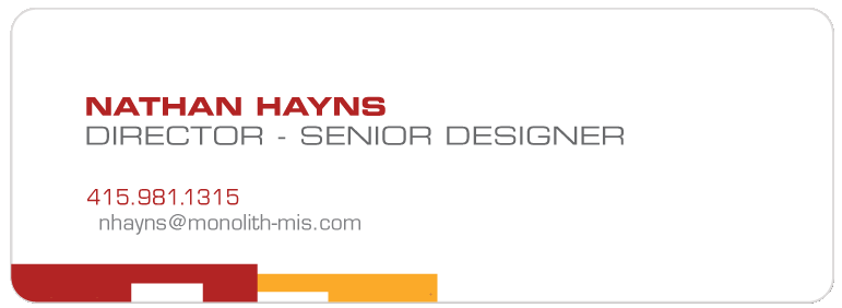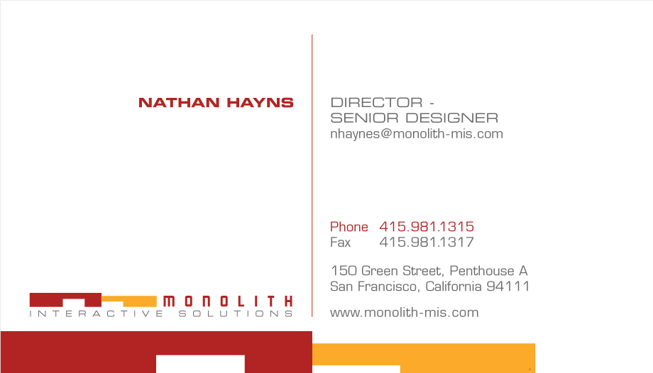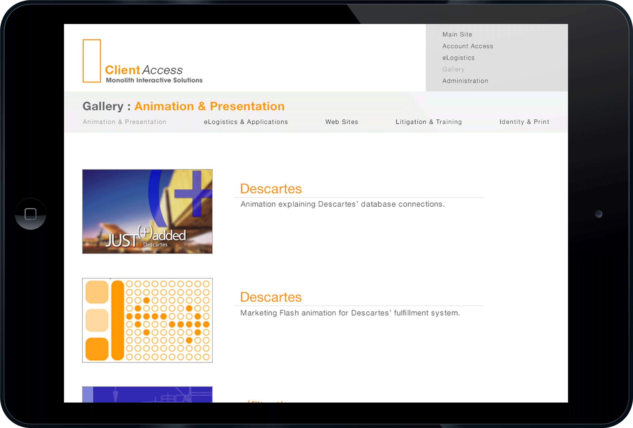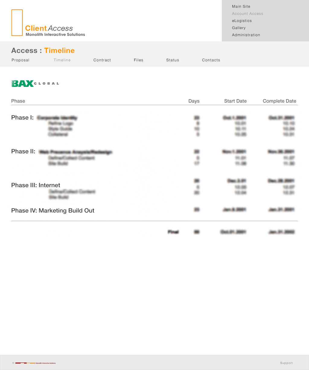 In addition to the companies identity package, I developed a password-secured website to allow clients of Monolith to view the status of their projects. The client could review prototypes, flowcharts, contracts, and deliverable dates, and could upload content and access the project before being finalized or going live. The site was also used to prepare individualized presentations for prospective clients.